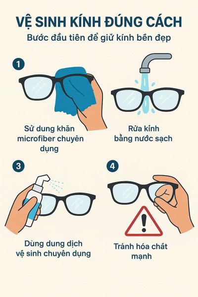 - Tránh hóa chất mạnh: Nước rửa chén, cồn, nước hoa hay các dung dịch tẩy rửa có thể ăn mòn lớp phủ chống tia UV và chống lóa, khiến kính xuống cấp nhanh chóng.